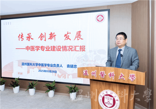 副院长袁拯忠作题为《传承创新发展》的中医学专业建设汇报,详细阐述了学校中医学专业的办学现状、特色与规划。他总结到,学校中医学经过60余年的积淀与发展,凝练形成了“大思政”引领、“小班制”教学、“重传承”实践、“强融合”教育、“国际化”拓展等五大育人模式,在未来,中医学将继续秉承承古纳今、衷中协西、医药融合的精神,发挥辨证论治和整体观的优势,培养更多德才兼备、有人文情怀的中医学子。