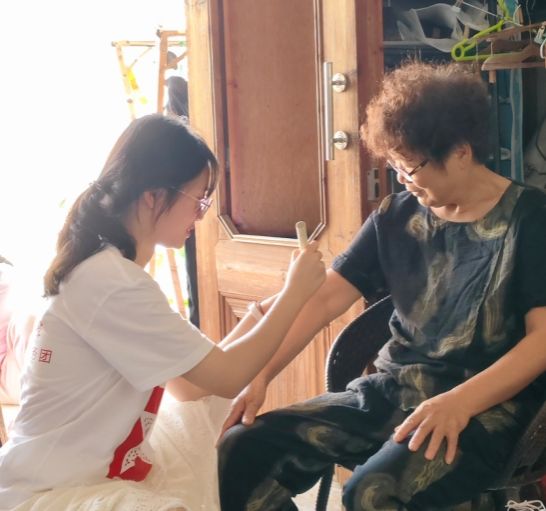 “是时三伏天,天气热如汤”,实践队员们不畏酷暑,带着艾灸条和耳穴贴,挨家挨户地走进村民家中,为他们提供艾灸与耳穴等中医理疗服务。林大娘三姐妹在接受义诊后,激动地说:“非常感谢91九色